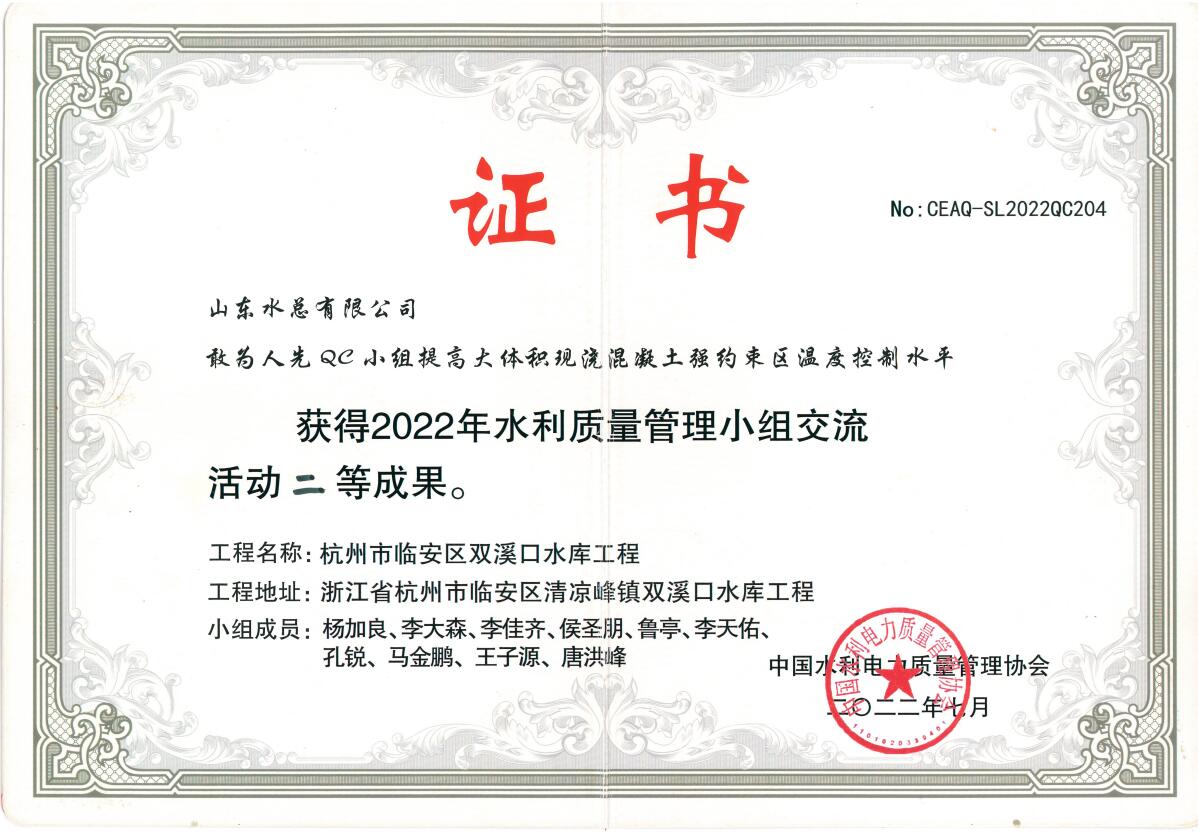 近日,中国水利电力质量管理协会2022年水利质量管理小组交流活动结果与获奖名单揭晓,公司申报的《提高钢坝闸闸墙外观质量一次验收合格率》获得一等成果、《提高混凝土拱坝止水埋设一次验收合格率》《提高大体积现浇混凝土强约束区温度控制水平》《提高坝基帷幕灌浆施工质量一次验收合格率》3项成果获得二等成果。
