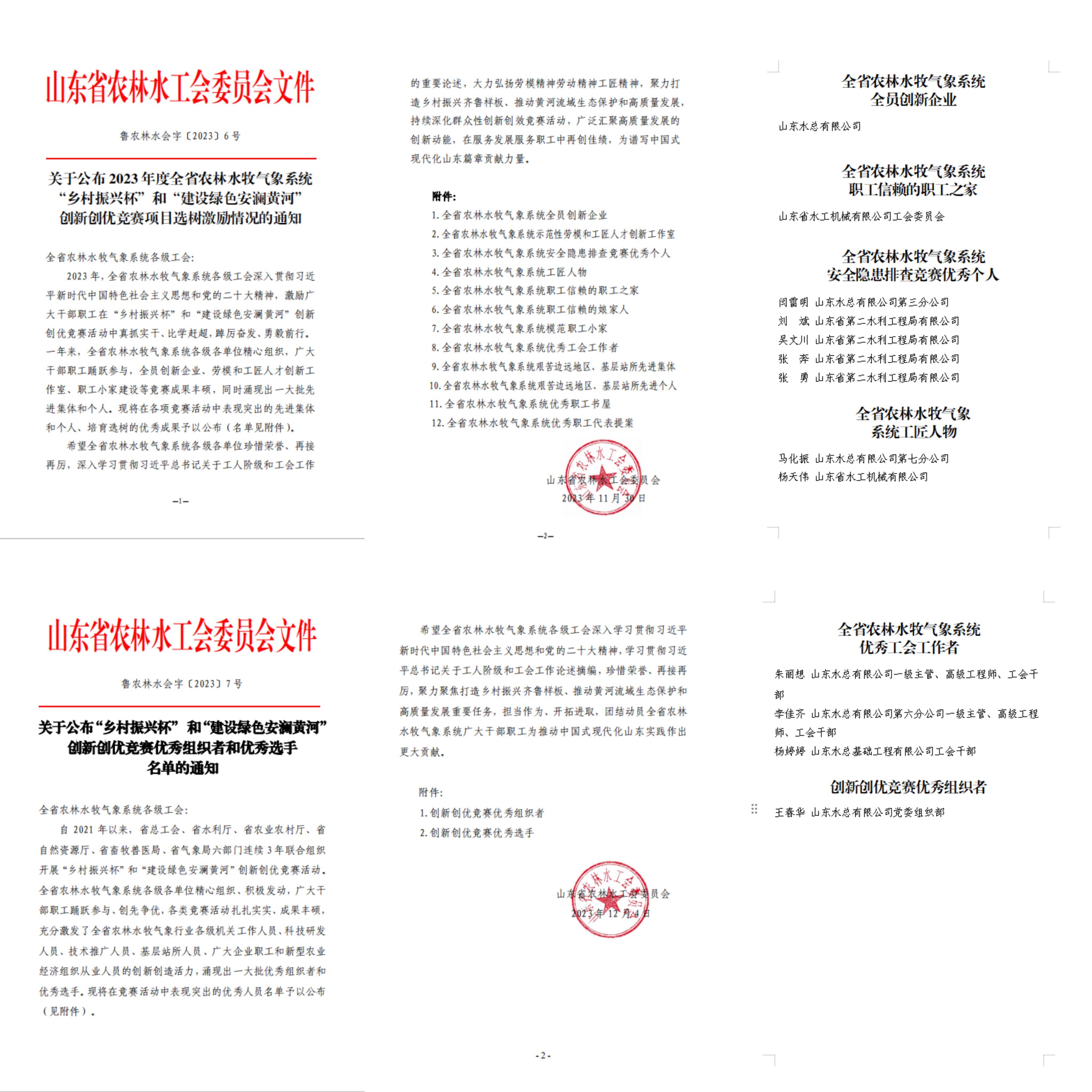 近日,山东省农林水工会下发了《关于公布 2023 年度全省农林水牧气象系统“乡村振兴杯”和“建设绿色安澜黄河”创新创优竞赛项目选树激励情况的通知》《“乡村振兴杯” 和“建设绿色安澜黄河”创新创优竞赛优秀组织者和优秀选手名单的通知》,山东水总荣获全省农林水牧气象系统全员创新企业,水工机械公司工会荣获“职工信赖的职工之家”,11人分别荣获“职工安全隐患排查竞赛优秀个人”“工匠人物”“优秀工会工作者”“创新创优竞赛优秀组织者”等称号。